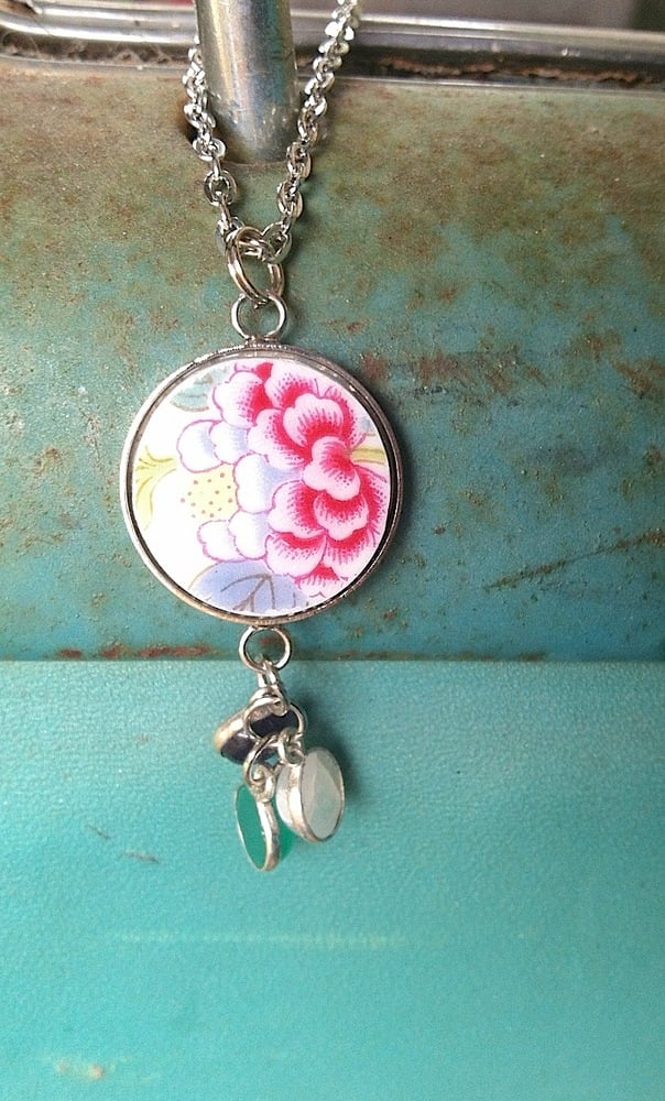 Circa 1960's, this delicate 3/4 inch pendant of perfect shaped china is set in a sterling plated bezel on a silver chain. Three tiny vintage glass gems add to the charm.